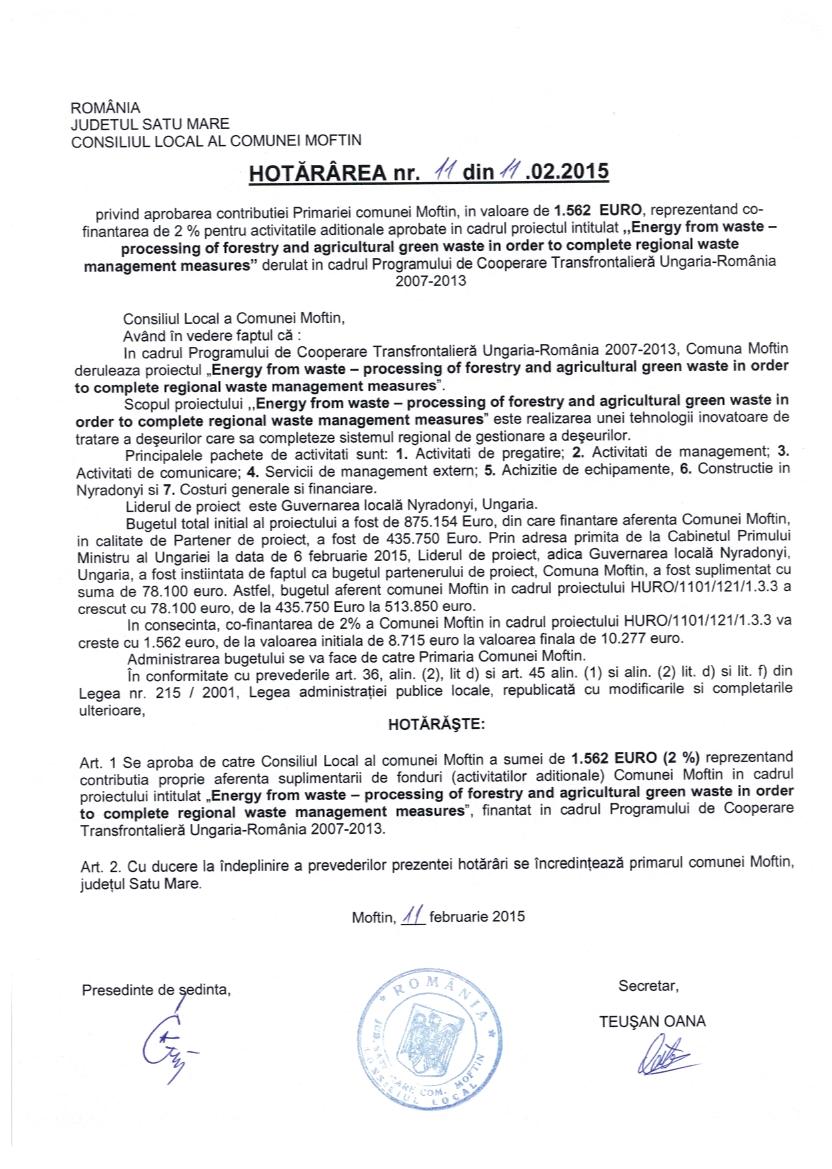 Hot nr 11 aprobarea contributiei Primariei Moftin reprezent. co fonantare de 2% pentru proiectul Energie din deseuri