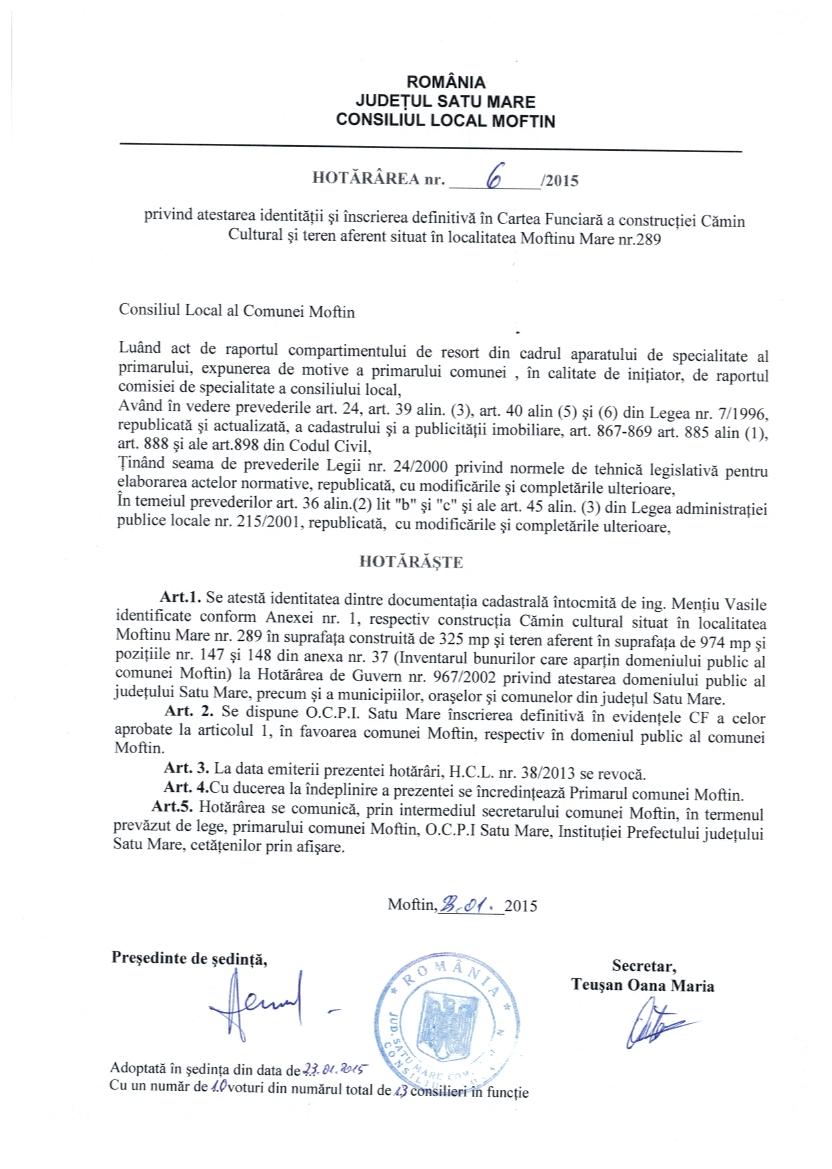 Hot nr 6 privind atestarea identitatii si inscrierea definitiva in cartea Funciara a constructiei Camin Cultural si teren aferent situat in localitatea Moftinu Mare nr 289