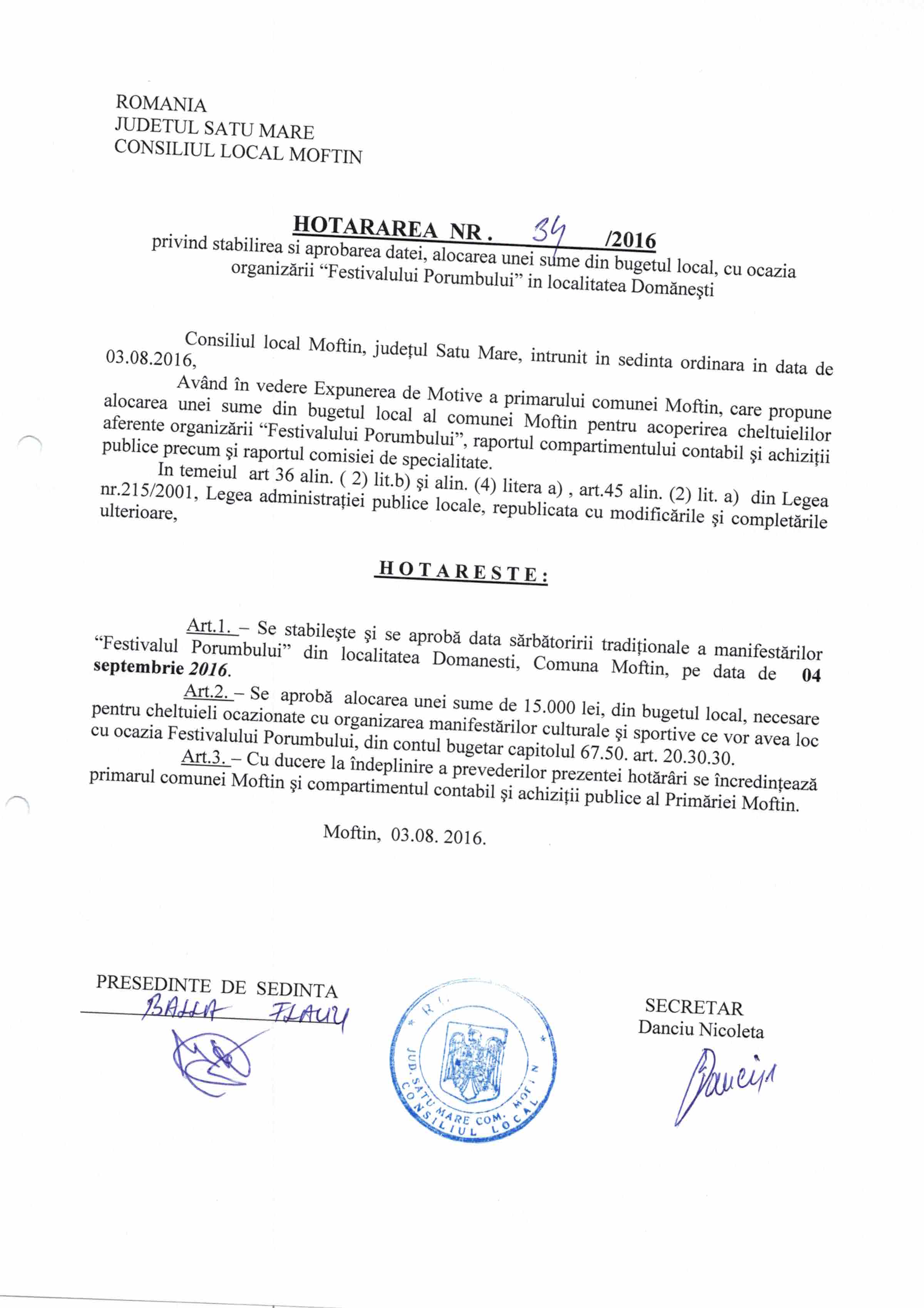 HOT 34 - stabilirea datei, alocarea unei sume din bugetul local cu organizarea Festivalului Porumbului din Domanesti