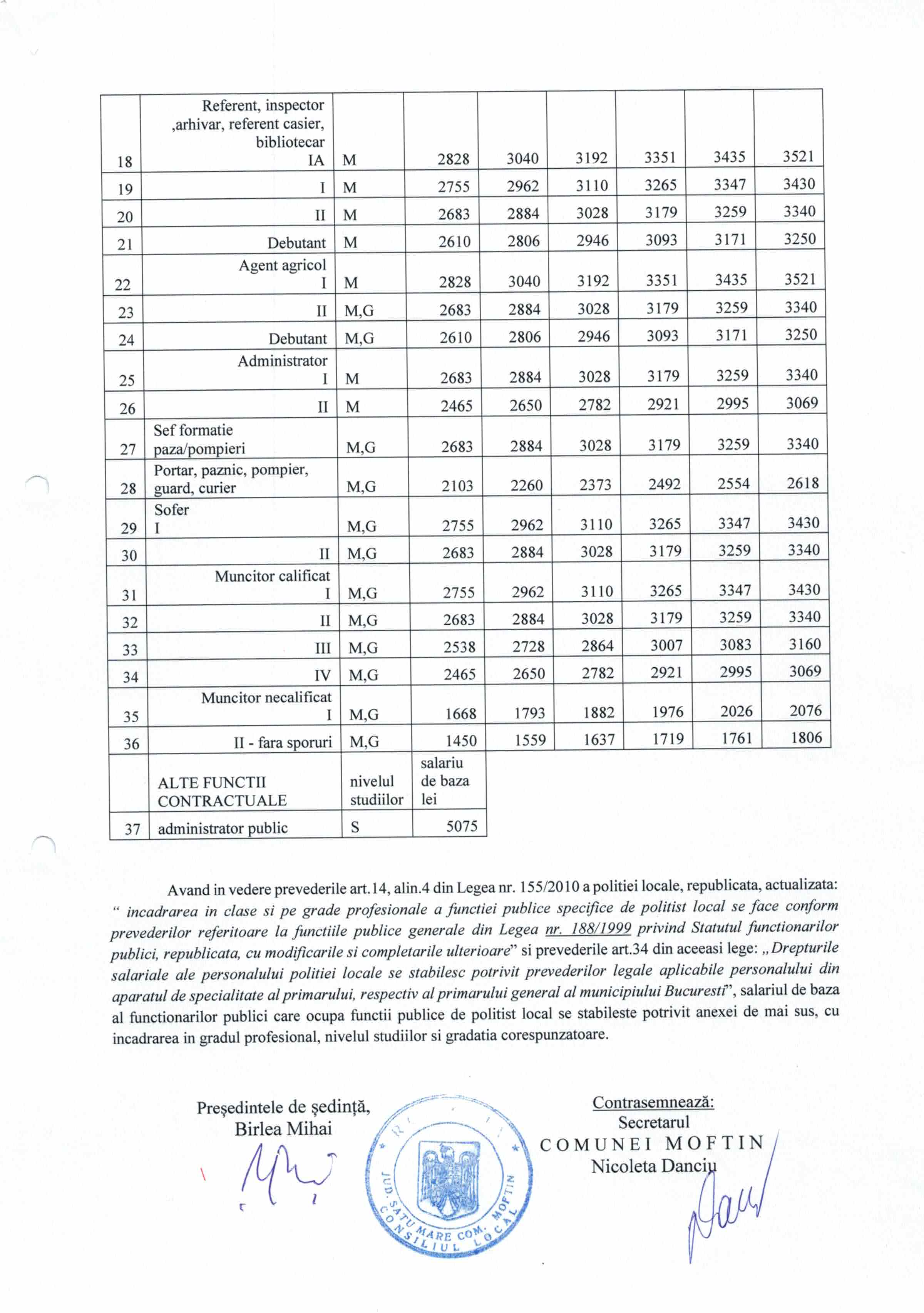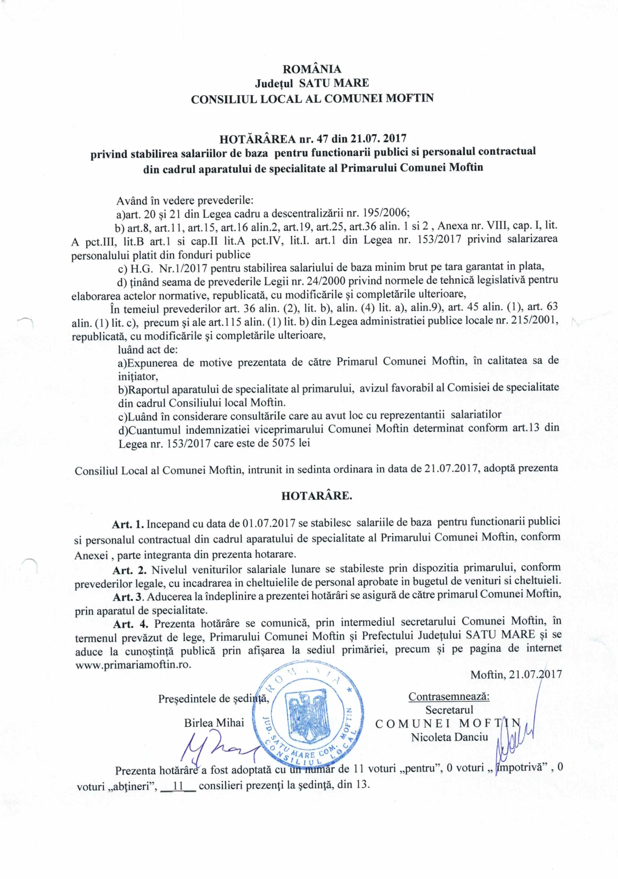 Hot. 47 - stabilirea salarilor de baza ptr. funct publici si personal contractual din cadrul Primariei Moftin