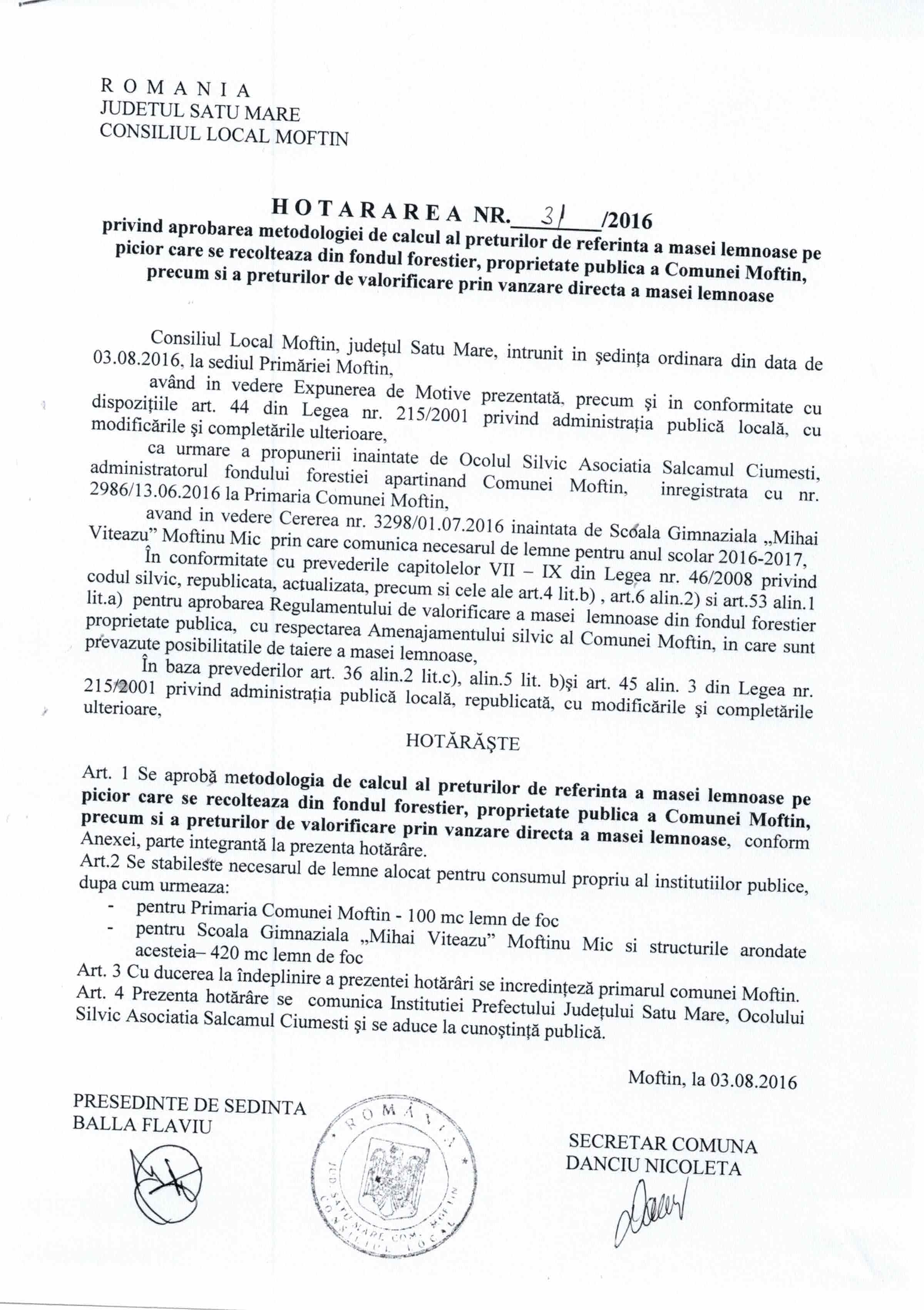 HOT 31 - metodologia de calcul al preturilor de referinta a masei lemnoase pe picior care se recolteaza din fondul forestier proprietate a CM