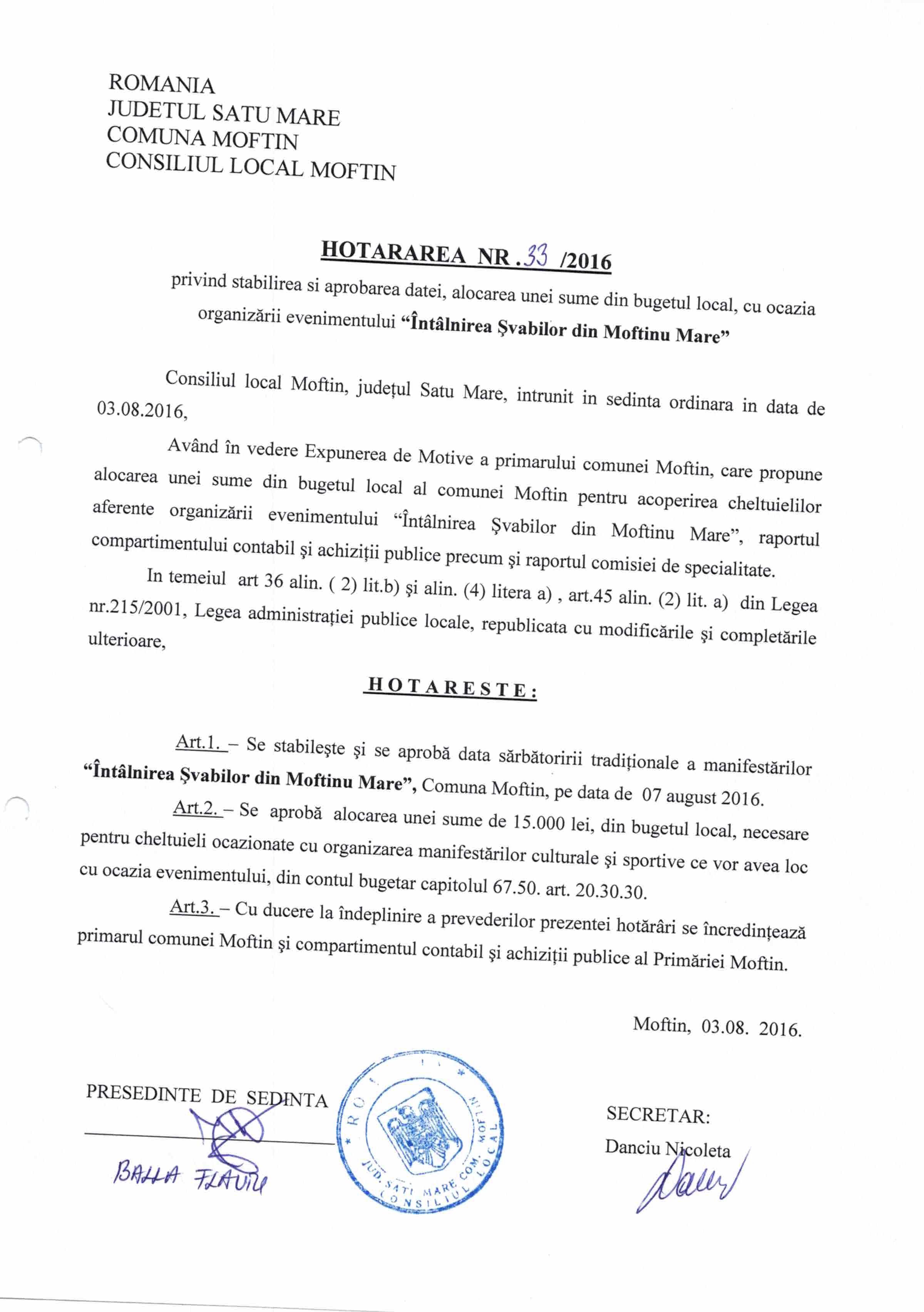 HOT 33 - stabilirea datei, alocarea unei sume din bugetul local cu organizarea Intalnirea svabilor din Moftinu Mare