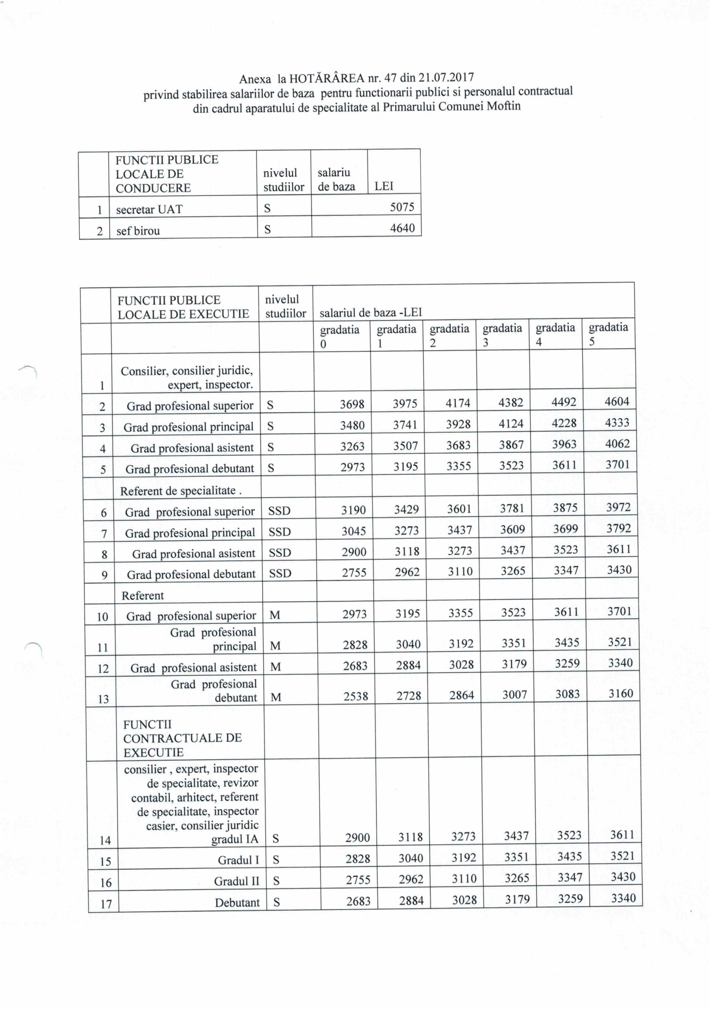 Hot. 47 - stabilirea salarilor de baza ptr. funct publici si personal contractual din cadrul Primariei Moftin